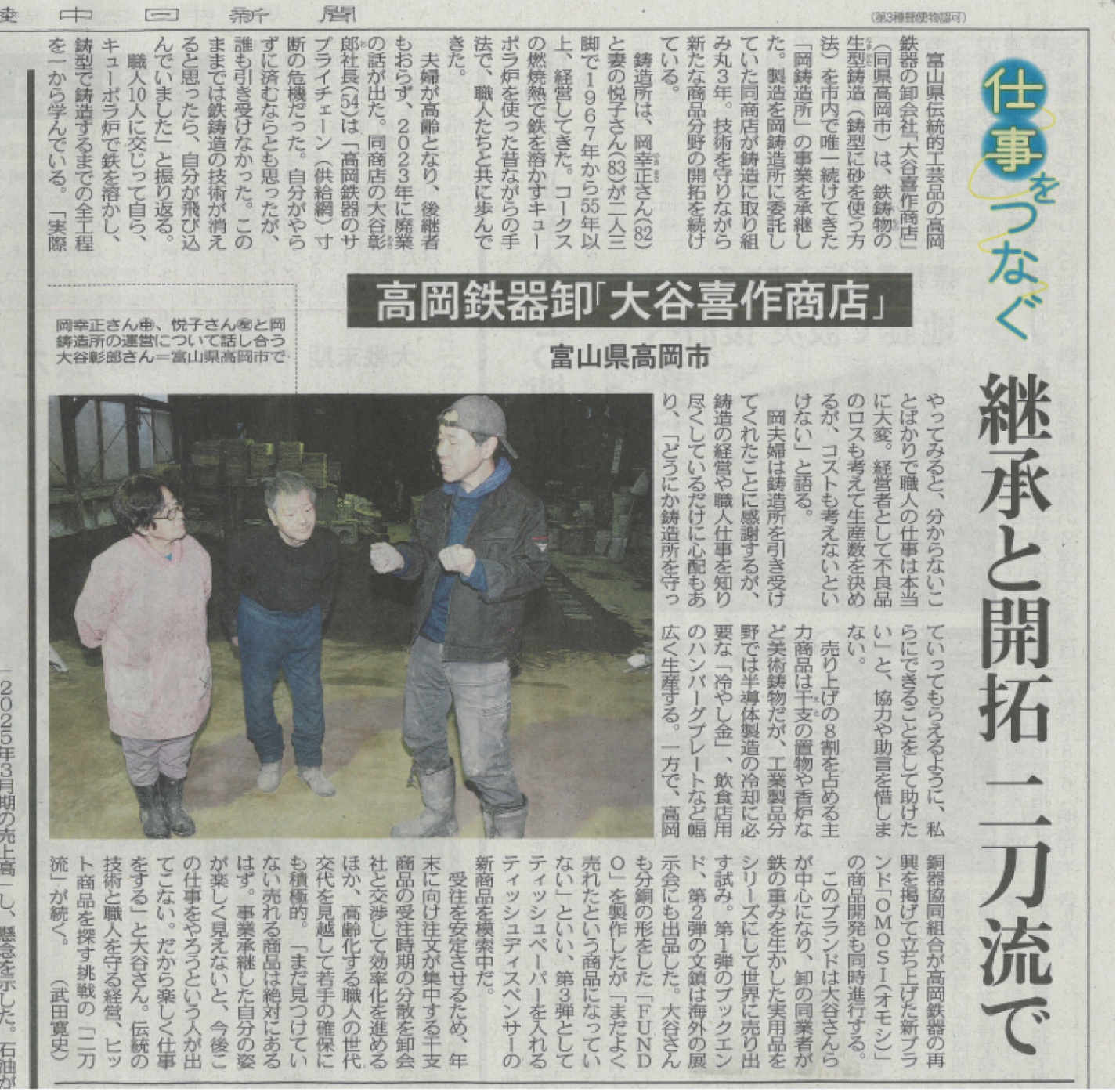 3/20(金)の北陸中日新聞にて、大谷喜作商店のこれまでの歩みと現場での取り組みを取り上げていただきました。