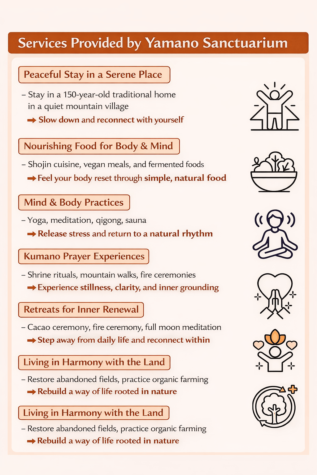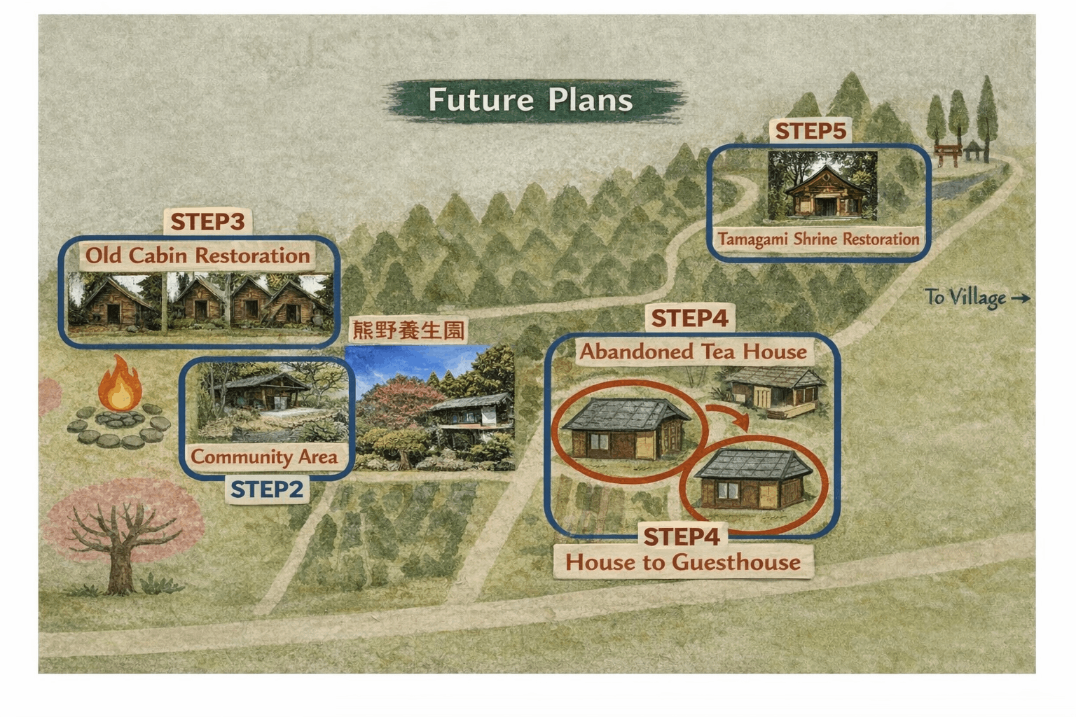 Our vision is to open “Yomigaeri Kumano Yojoen,” a place where people can reconnect with nature, their bodies, and a deeper sense of themselves.