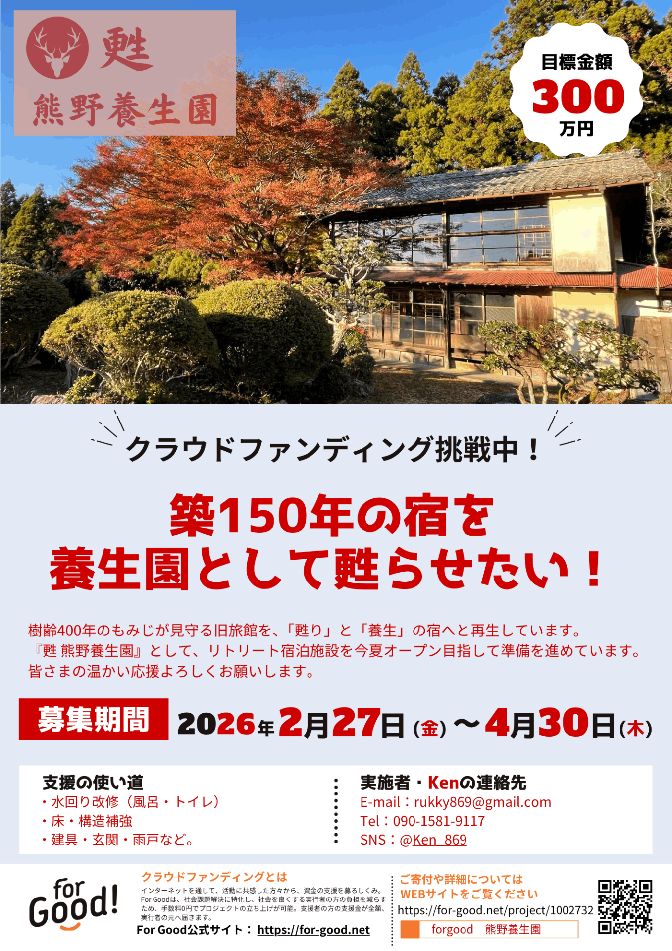 【熊野】樹齢400年のもみじが見守る築150年の宿を、養生園として甦らせたい!