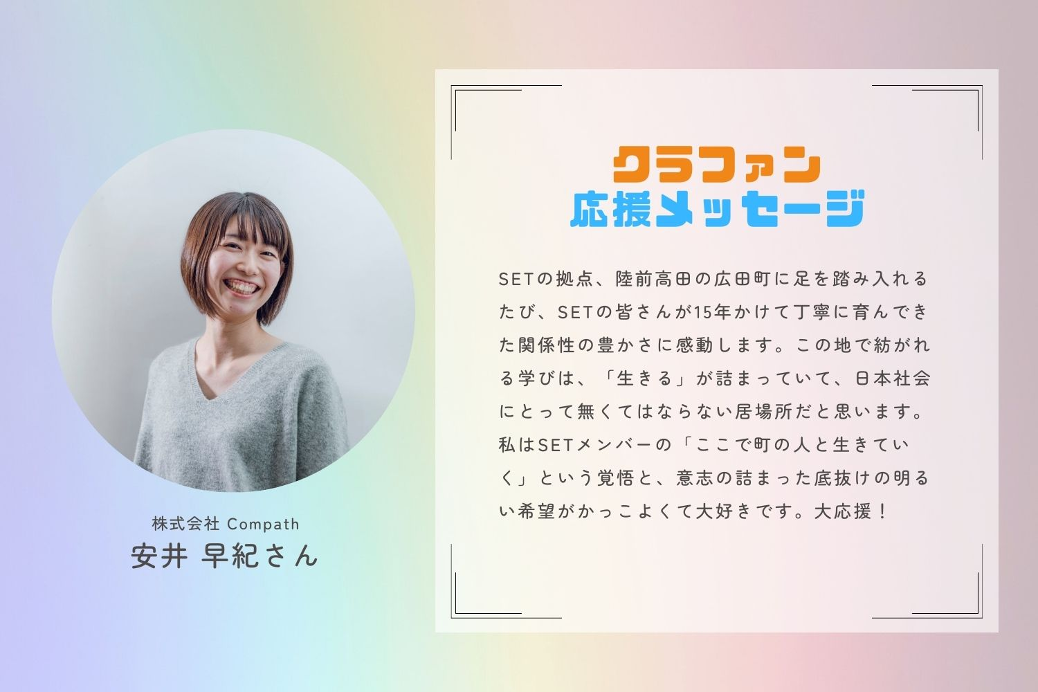 この受賞は、日頃からSETの活動を支えてくださっている地域の皆さん、そして応援してくださる多くの方々のおかげです。これからも町の方々と共に、若者が地域に関わる新しい形をつくっていきたいと思います。引き続き応援よろしくお願いいたします。