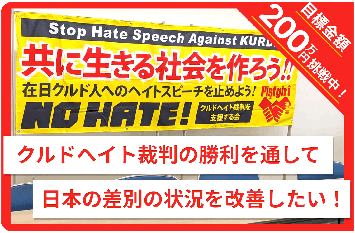 本セミナーを主催した「クルドヘイト裁判を支援する会」では、ヘイトスピーチを伴うデモの差止めなどを求める裁判の弁護士費用を集めるためのクラウドファンディングを実施しています。