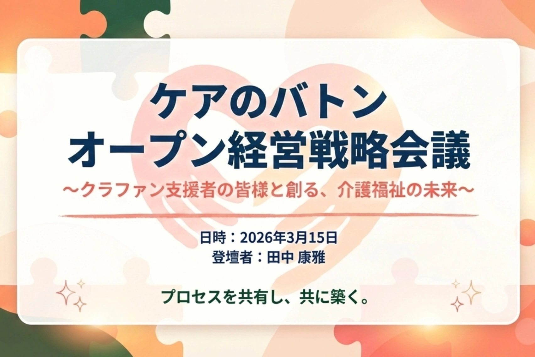 こんにちは。ケアのバトン 代表の田中康雅です。先日、クラウドファンディングでのご支援をいただいた方をお招きし、「ケアのバトン 経営戦略会議」を開催いたしました。対面・オンライン、そしてアーカイブ視聴...
