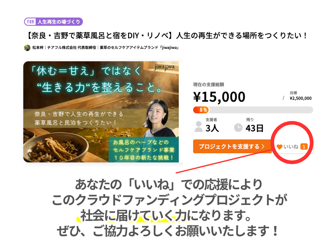 目標金額は250万円。皆様からいただいた支援は、こだわりの「薬草風呂」の設置や、古民家を快適に過ごせる場所にするための改修費(土間の再生、キッチンの設置など)として大切に使わせていただきます。