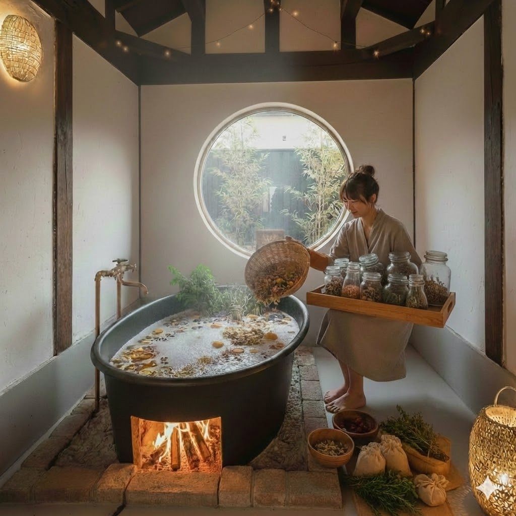 自分で選んだ薬草袋をお湯に浮かべると、ふわりと自然の香りが立ち上ります。 お湯に身を沈めると、薪の熱と薬草の成分が、じわじわと体の奥深くへ染み渡っていきます。