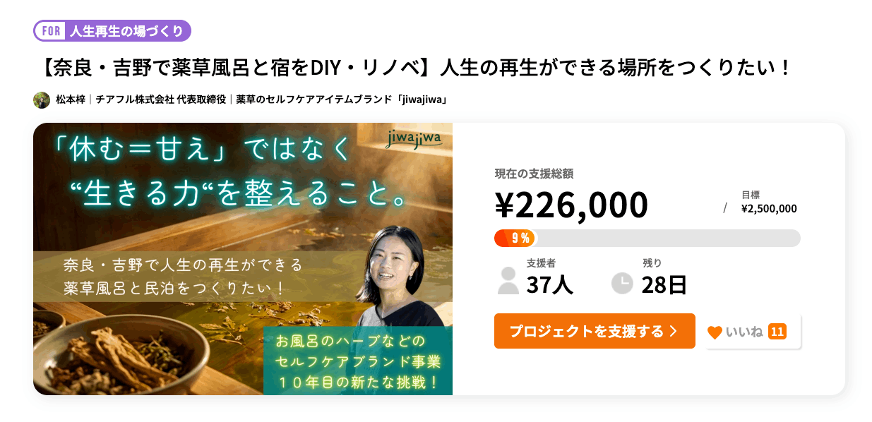 実施中のクラウドファンディングについて、現在37名の方から226,000円のご支援をいただいています。