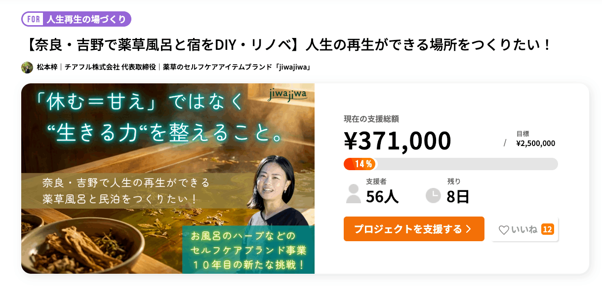 先日追加させていただいた「一棟貸し宿と薬草風呂のモニター宿泊プラン」と、jiwajiwa商品と書籍でのご支援、応援メッセージをありがとうございます!