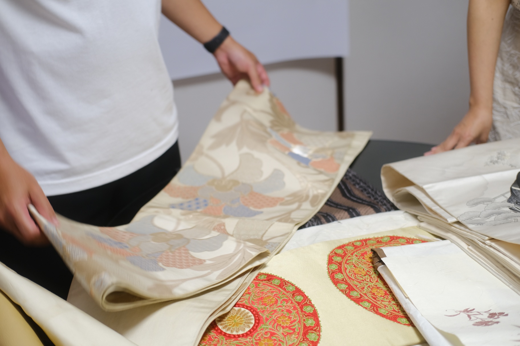 役目を終えた着物や帯の生地を一枚一枚選び、蜜蝋で丁寧にコーティングすることで、紙のように折れて、布のようにしなやかな、新しい質感の「折り紙」が生まれました。