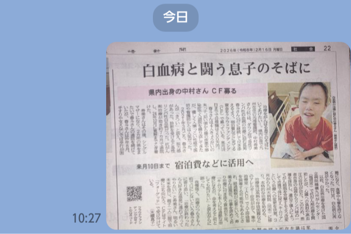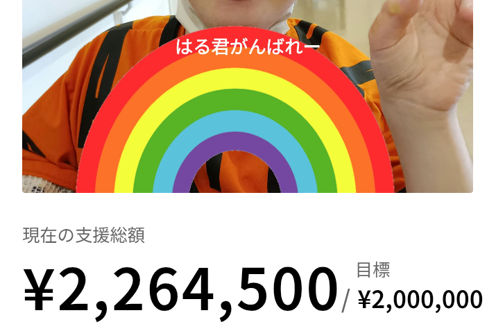 皆様の思い、絆によりまして、ファーストゴール達成出来ました。本当にありがとうございます。御支援頂きました支援金は、今迄の治療費や、入院にかかる費用にあてさせて頂いております。3月の治療親子で必ず乗り切って...