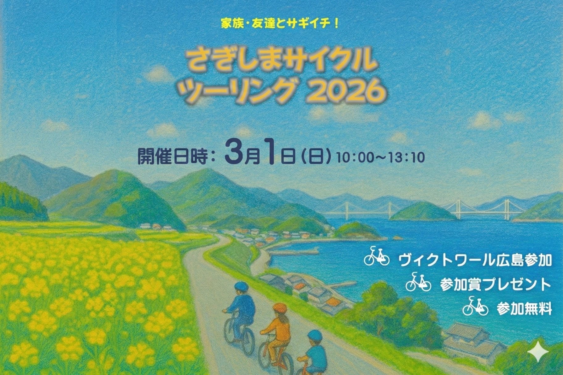 いつもヴィクトワール広島、そして本プロジェクトへのご支援をありがとうございます。この度、2026年3月1日(日)開催「さぎしまサイクルツーリング2026」にヴィクトワール広島の選手が参加いたします!瀬戸内海...