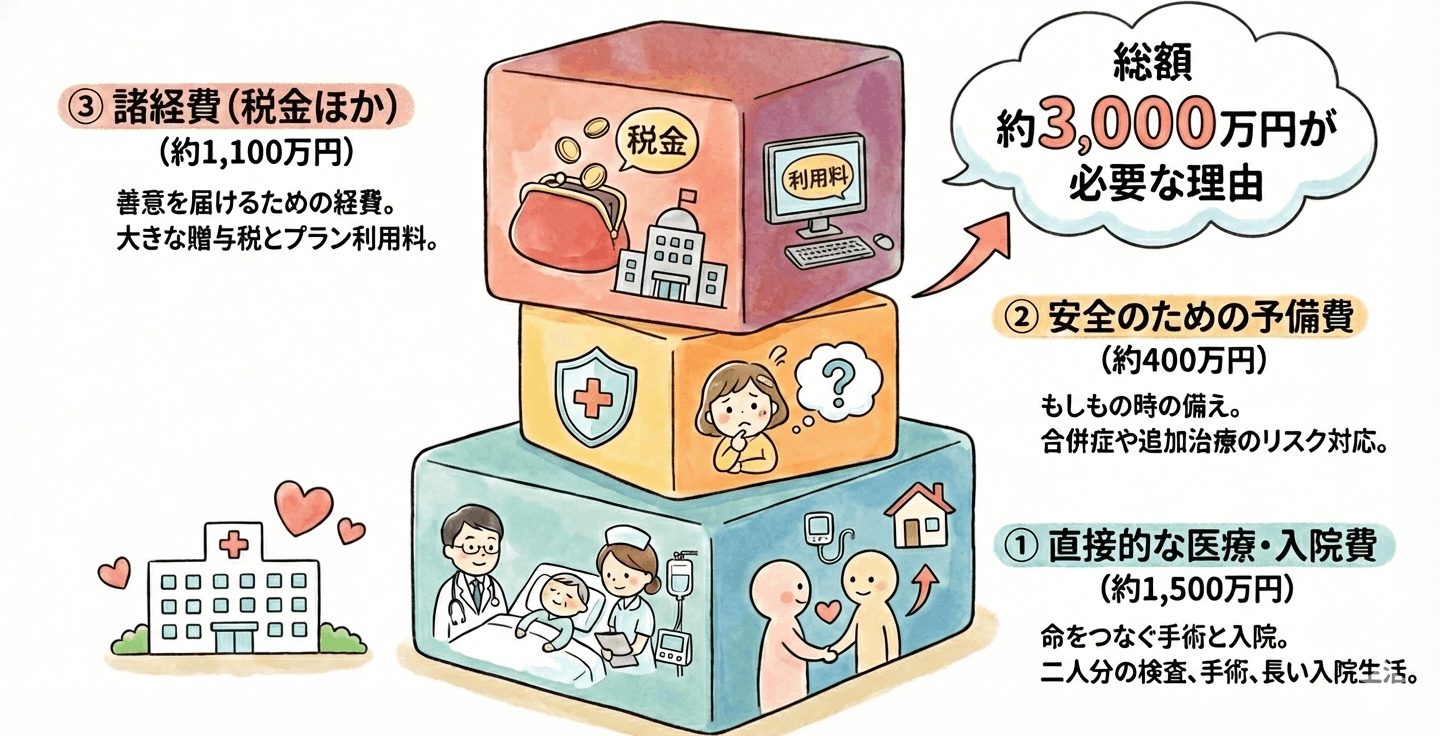 分かりやすいように、必要になる費用の内訳と、実際に治療に残る金額の考え方を図解で追記しました。