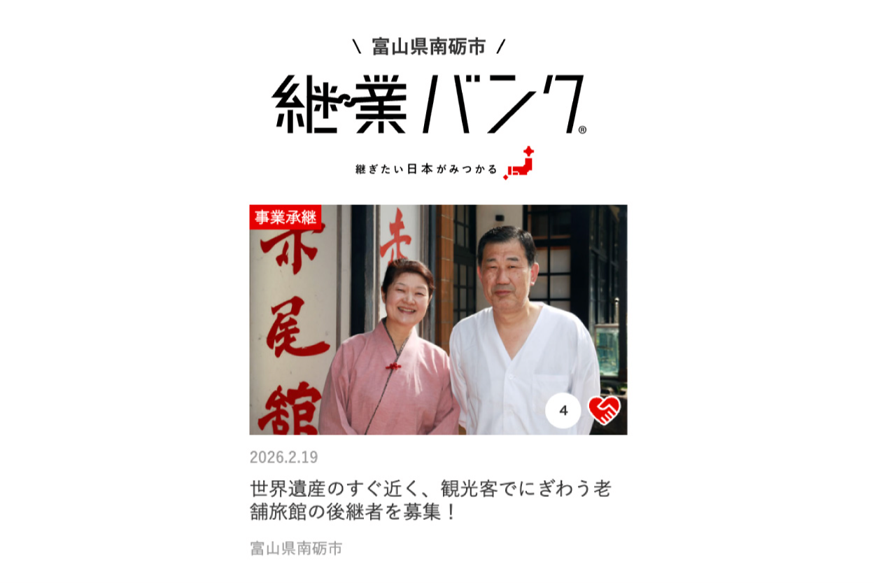 富山県南砺市で新たな後継者募集記事を掲載しました!まもなく創業100年を超える老舗旅館の担い手募集です。▼記事はこちらからhttps://keigyo.jp/successor/nanto0007/ニホン継業バンクでは自治体や地域のパート...