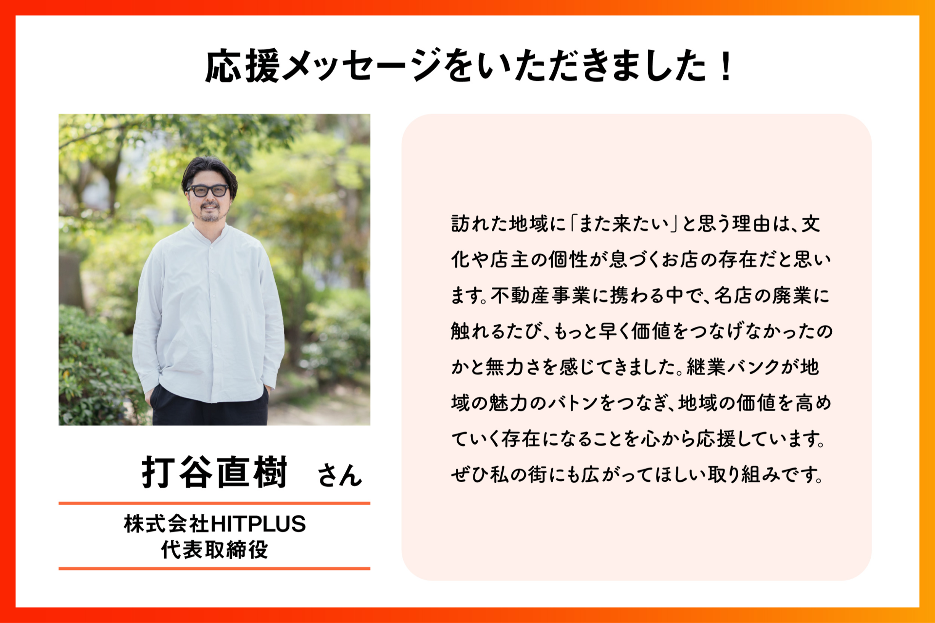 \応援メッセージのご紹介/”株式会社HITPLUS 代表取締役 打谷直樹さん”から応援メッセージをいただきました。⋯⋯⋯⋯⋯訪れた地域に「また来たい」と思う理由は、文化や店主の個性が息づくお店の存在だと思います。...