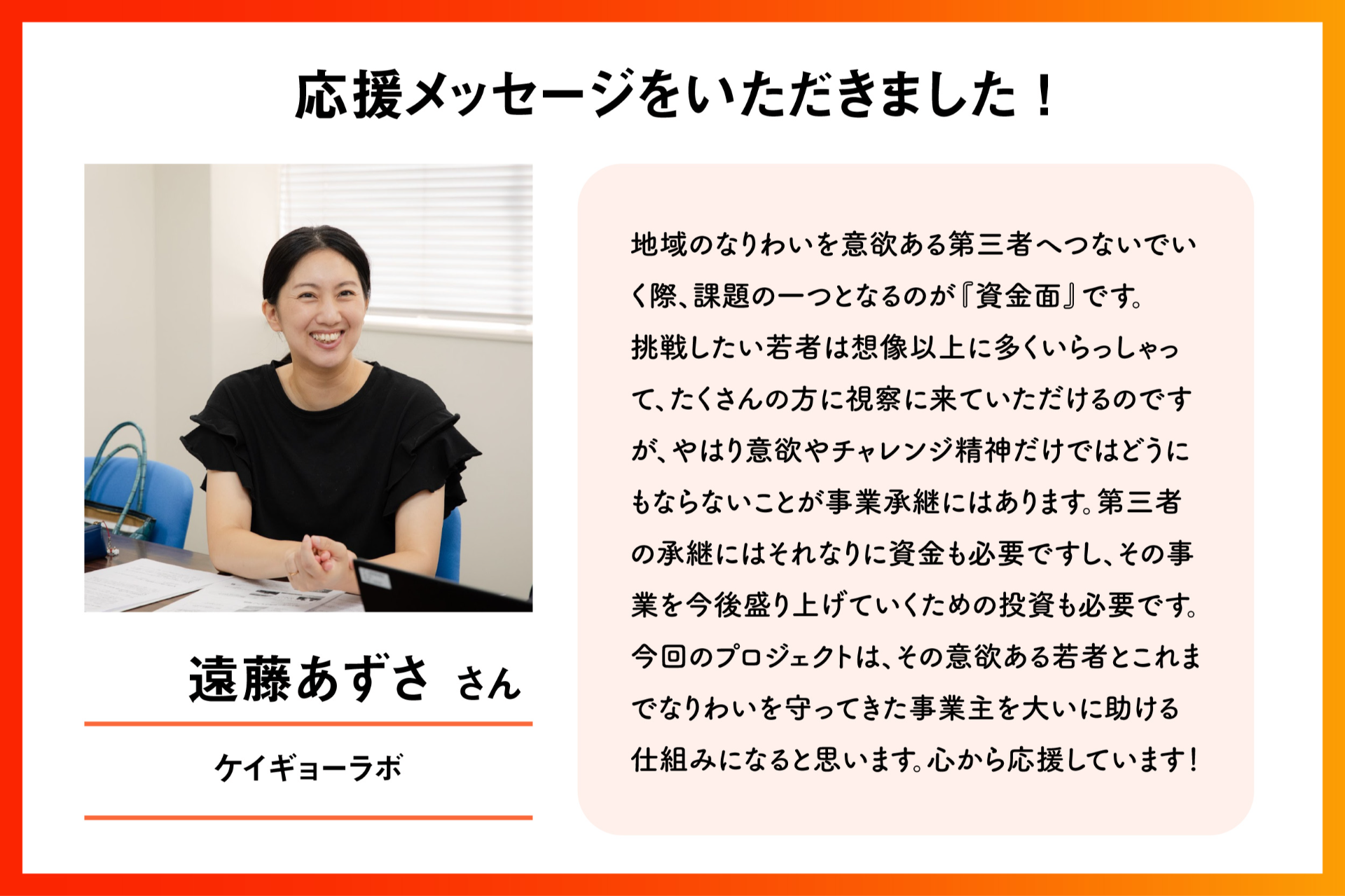 \応援メッセージのご紹介/”ケイギョーラボ 遠藤あずささん”から応援メッセージをいただきました。⋯⋯⋯⋯⋯地域のなりわいを意欲ある第三者へつないでいく際、課題の一つとなるのが『資金面』です。挑戦したい若者...