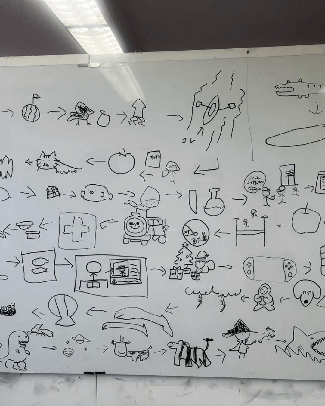 聞き手と逆の手で描いて教室長が答えられるのかをゲームします。