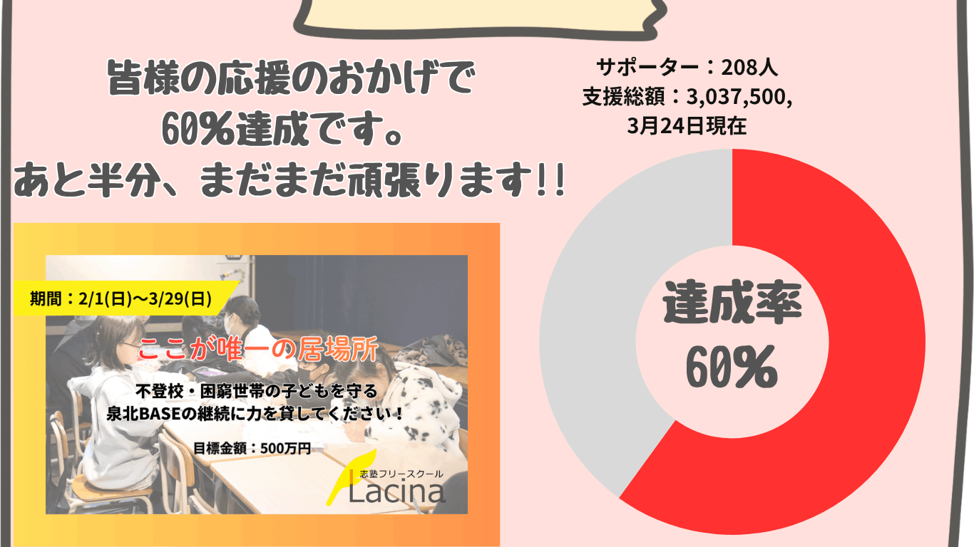 先ほど、達成率が60%を超しました!!それにより、総支援額が300万円を超しました。