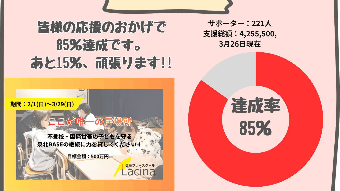 なんと!皆様のご支援のおかげで85%まで達成しました!