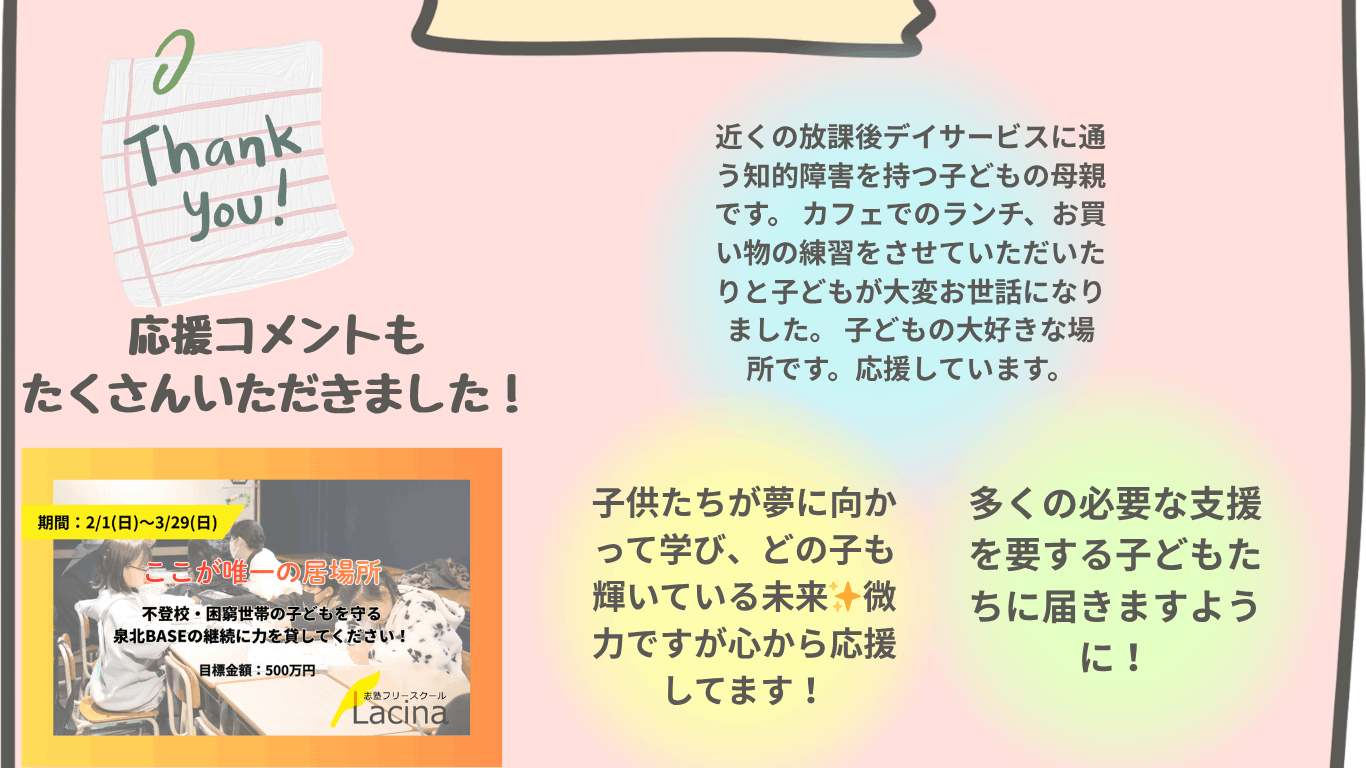 直接ご支援してくださった方はもちろん、拡散のご協力をいただいた方も、ありがとうございます。