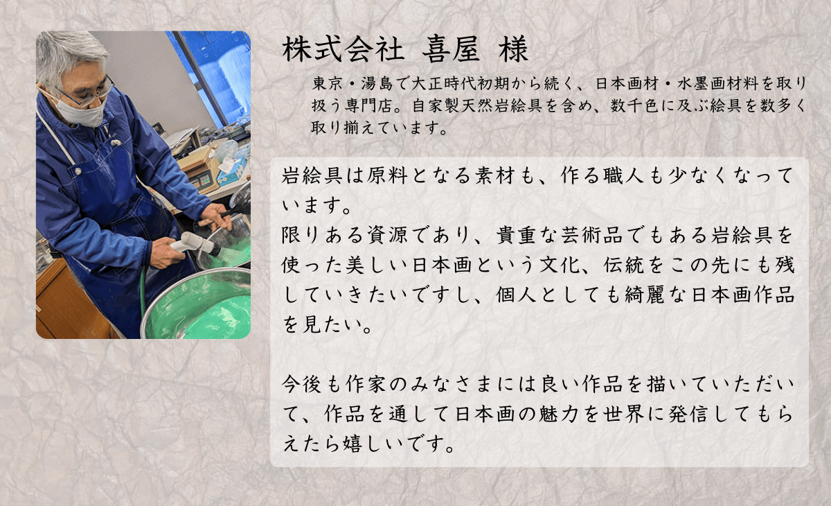 日本画は欧米ではとても人気があり注目されていると感じます。日本の画材業界でそれが縮小してしまうのはとても残念な現状で、興味深く大事な活動と思い、少額ですが協力させていただきました。