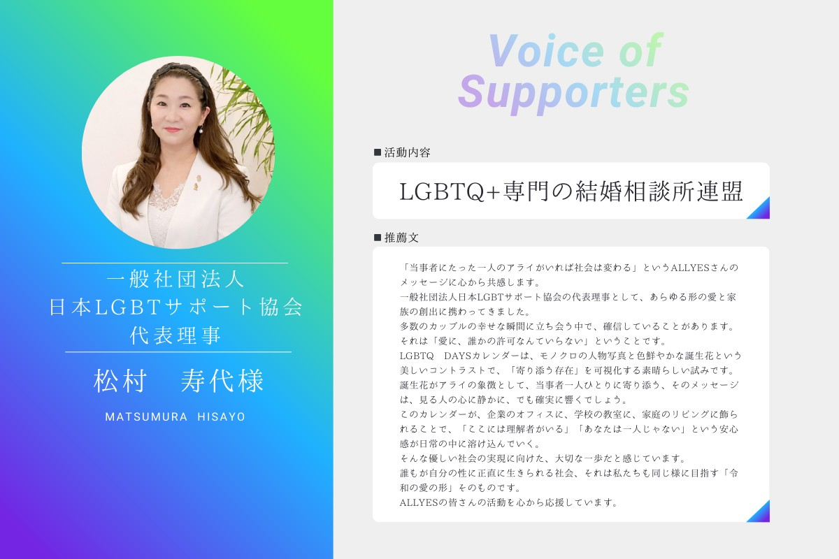 1,000万人のアライを!「ALLY1000万人PJ」への挑戦を機に、2023年9月発足し600名近くのメンバー在籍。全国のプライドイベントへの出店やワークショップ開催を通じ、自分の性に正直に生きられる社会の実現を目指している。本企画では初のカレンダー制作に挑戦。
