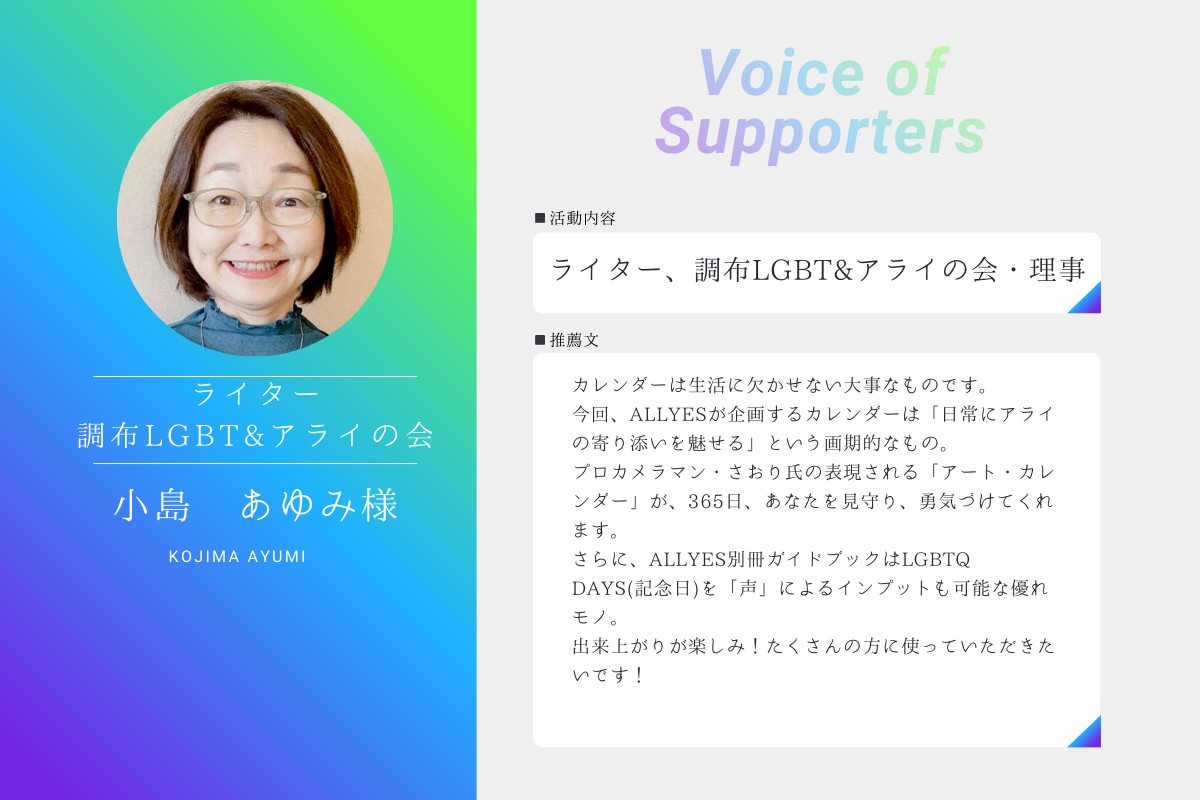 「LGBTQDAYS」プロジェクトを応援してくださっている皆さま、プロジェクト発起人の新生光ですです。本プロジェクトに深く共感してくださり、アライの「小島あゆみさん」から届いた熱い推薦メッセージをご紹介し...