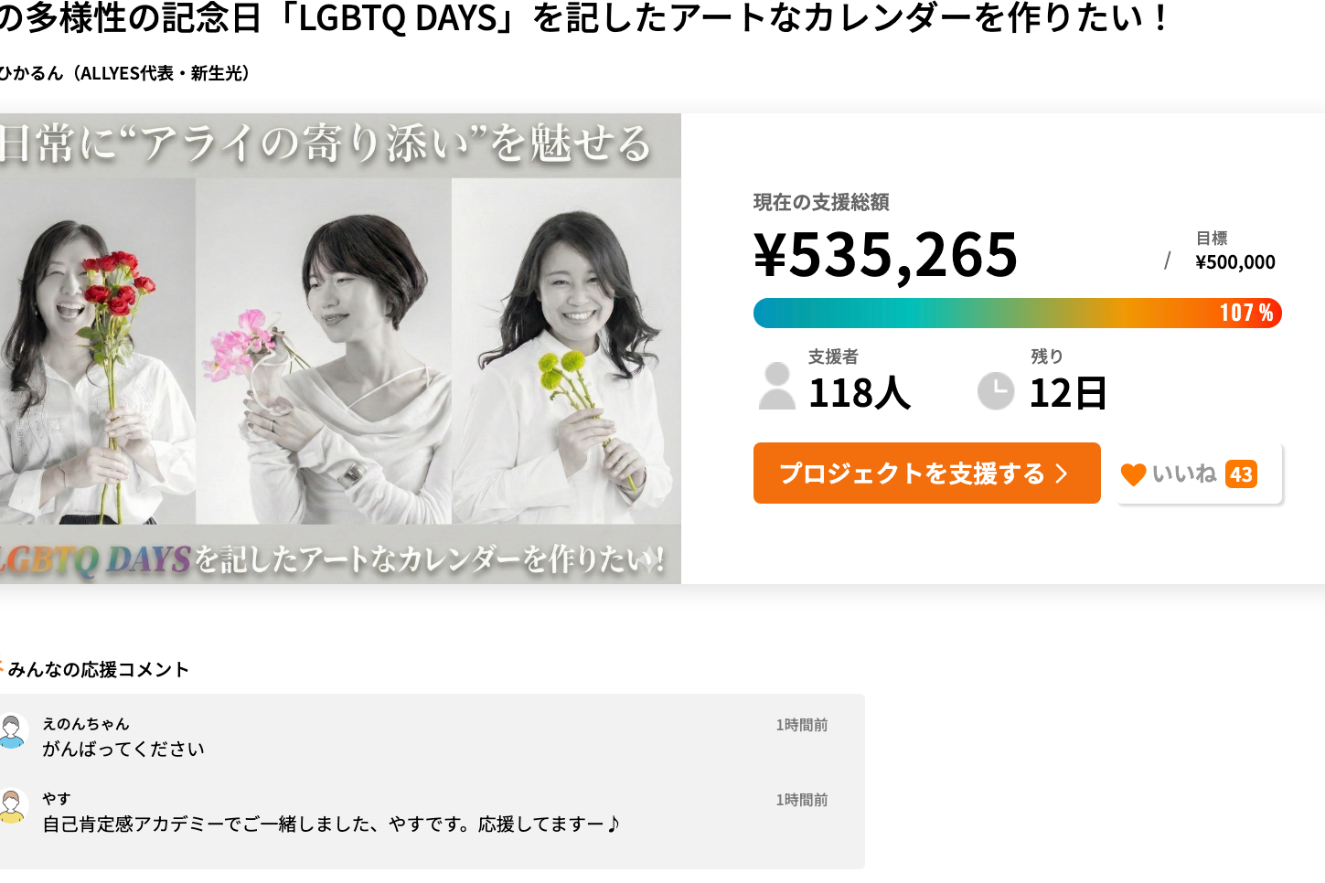 皆様、いつも温かい応援を本当にありがとうございます! ALLYES代表のひかるん(新生光)です。現在挑戦中の「LGBTQ DAYS」カレンダー制作プロジェクトですが、皆様のおかげで支援者様73名、達成率53%まで到達いたしまし...