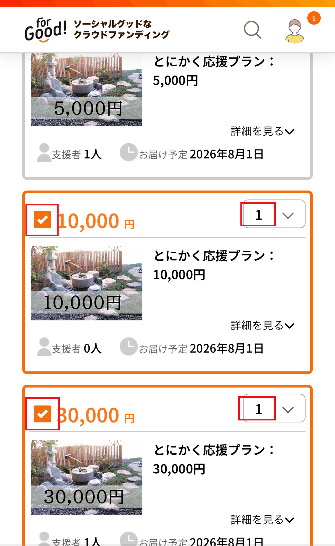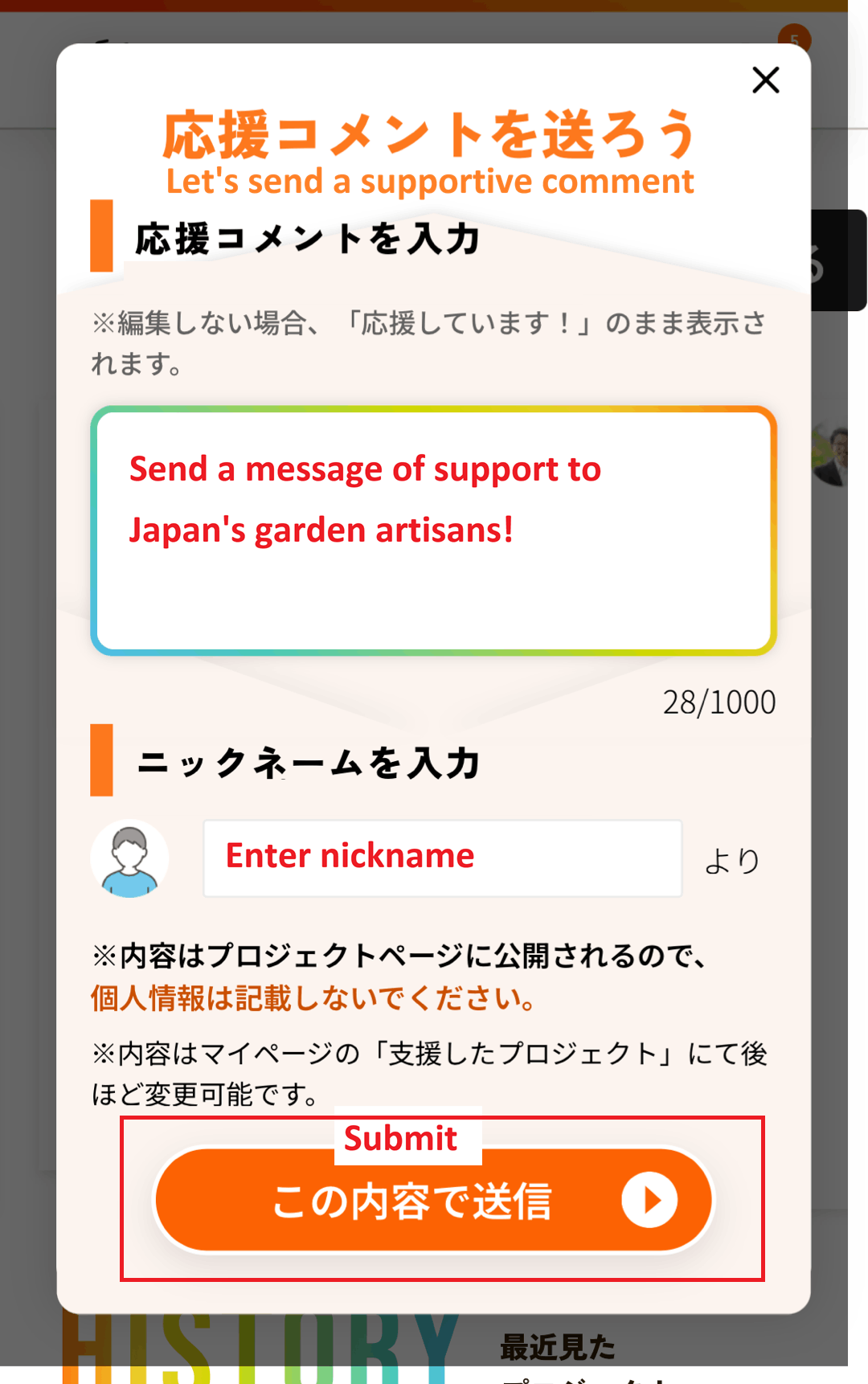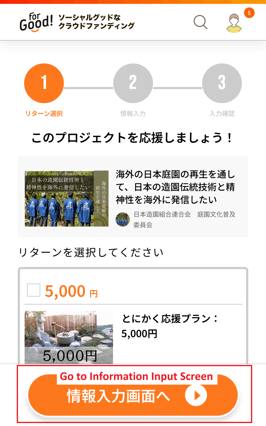 Cliquez sur le bouton orange プロジェクトを支援する (Soutenir ce projet). Sélectionnez votre montant, puis cliquez sur 情報入力画面へ (Aller à l'écran de saisie).