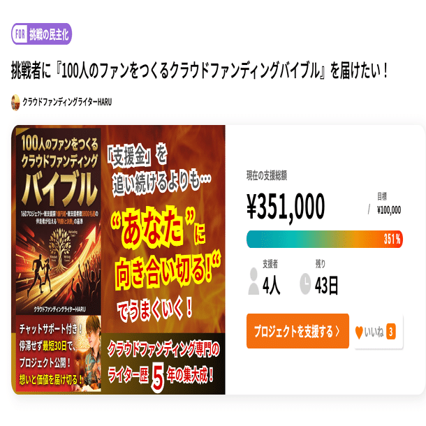 現在、クラウドファンディングプロジェクトに、4名のあなたから351,000円のご支援をいただいています。目標達成率は351%に到達し、目標達成しました!