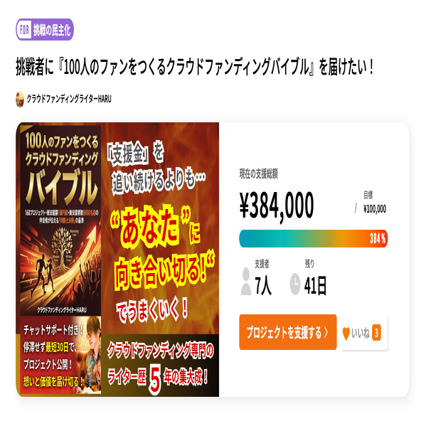 挑戦者に『100人のファンをつくるクラウドファンディングバイブル』を届けたい!
