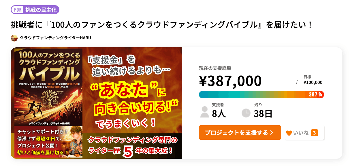 挑戦者に『100人のファンをつくるクラウドファンディングバイブル』を届けたい!