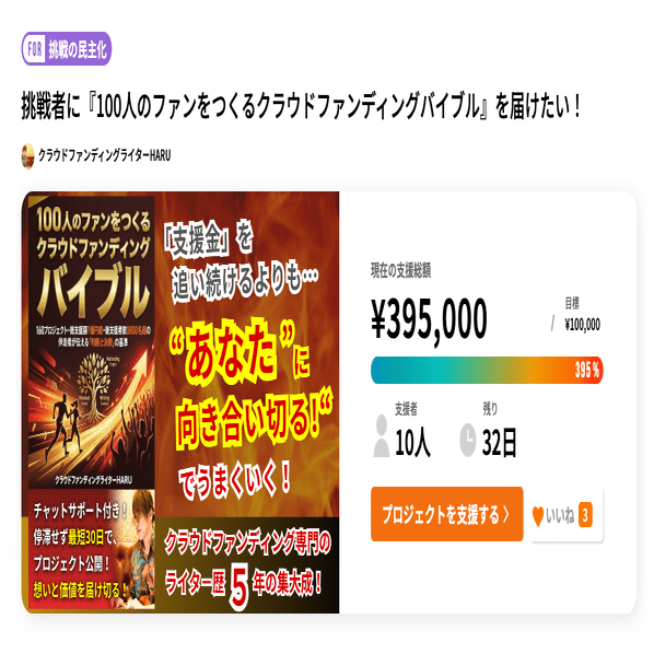 挑戦者に『100人のファンをつくるクラウドファンディングバイブル』を届けたい!