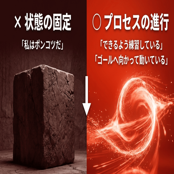 こういった、「私はポンコツ」「ダメな人間」といった【名詞】や【形容詞】で自分を表現することは、自分自身をその状態に「固定」してしまう行為。固定された言葉は言い訳を生み、停滞を招いていく。
