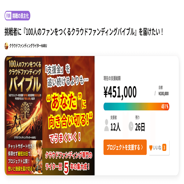 挑戦者に『100人のファンをつくるクラウドファンディングバイブル』を届けたい!