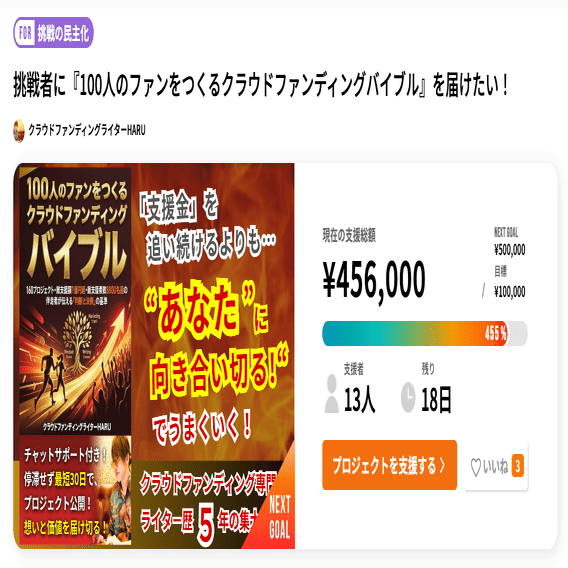 挑戦者に『100人のファンをつくるクラウドファンディングバイブル』を届けたい!