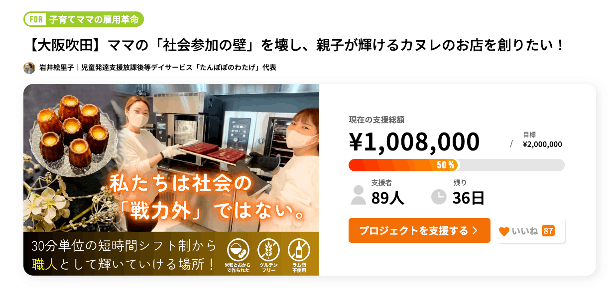 【大阪吹田】ママの「社会参加の壁」を壊し、親子が輝けるカヌレのお店を創りたい!