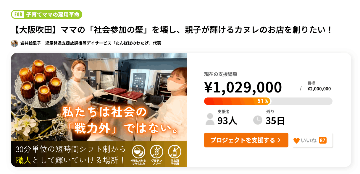 【大阪吹田】ママの「社会参加の壁」を壊し、親子が輝けるカヌレのお店を創りたい!