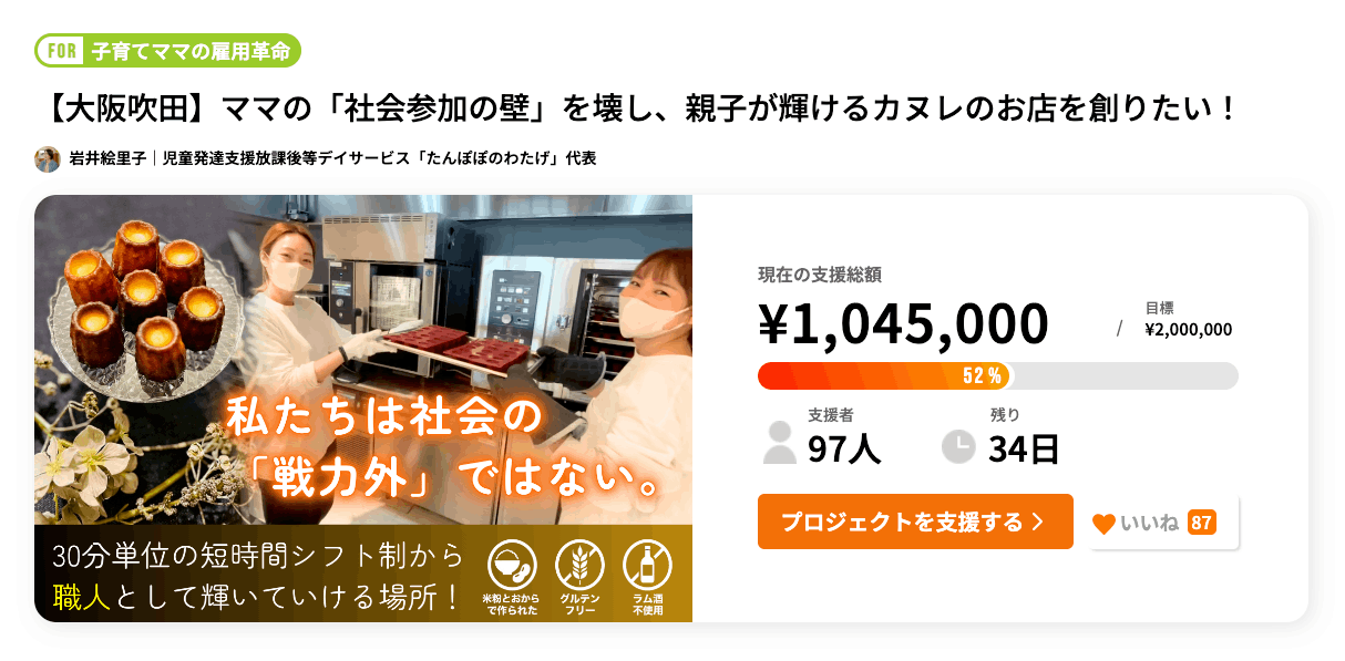 【大阪吹田】ママの「社会参加の壁」を壊し、親子が輝けるカヌレのお店を創りたい!