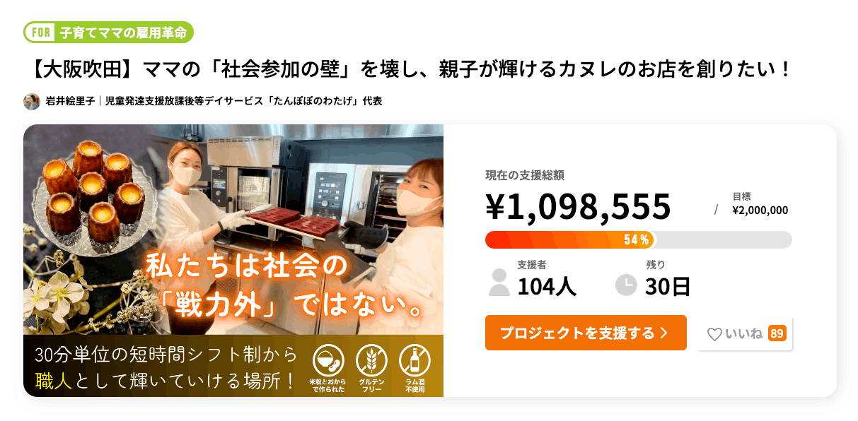 【大阪吹田】ママの「社会参加の壁」を壊し、親子が輝けるカヌレのお店を創りたい!