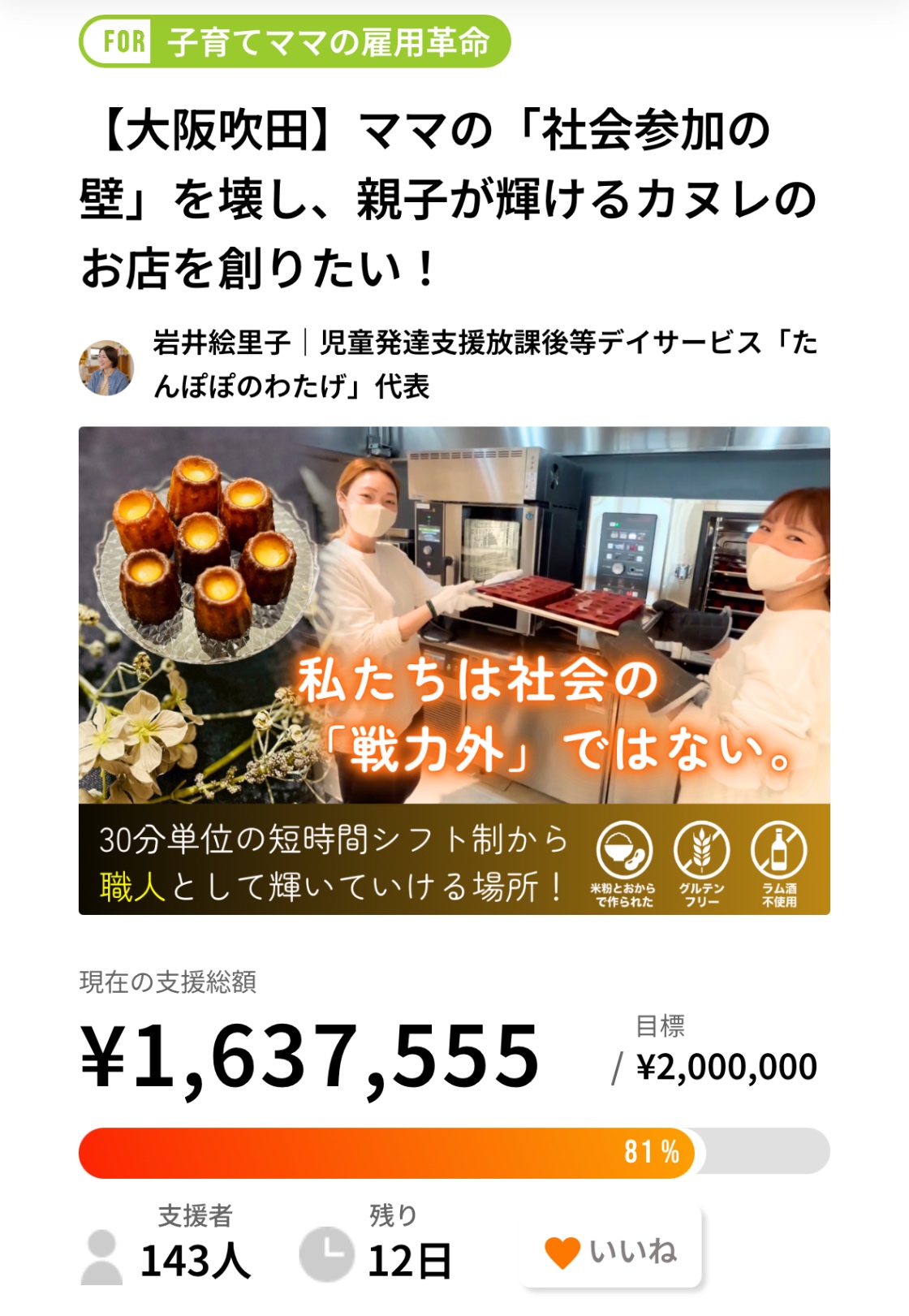 【大阪吹田】ママの「社会参加の壁」を壊し、親子が輝けるカヌレのお店を創りたい!