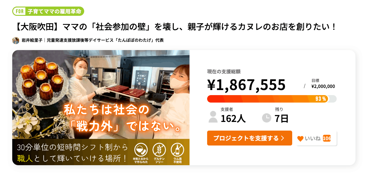 【大阪吹田】ママの「社会参加の壁」を壊し、親子が輝けるカヌレのお店を創りたい!