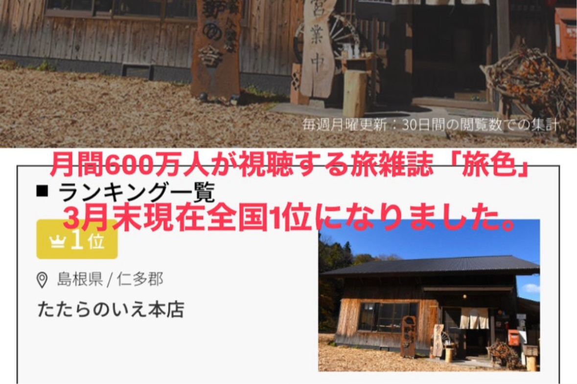 いつも「たたらのいえ」を応援していただき、誠にありがとうございます。この度、旅雑誌の人気ランキングにて全国1位を獲得することができました。日頃から応援してくださっている皆さまのおかげです。本当にあ...