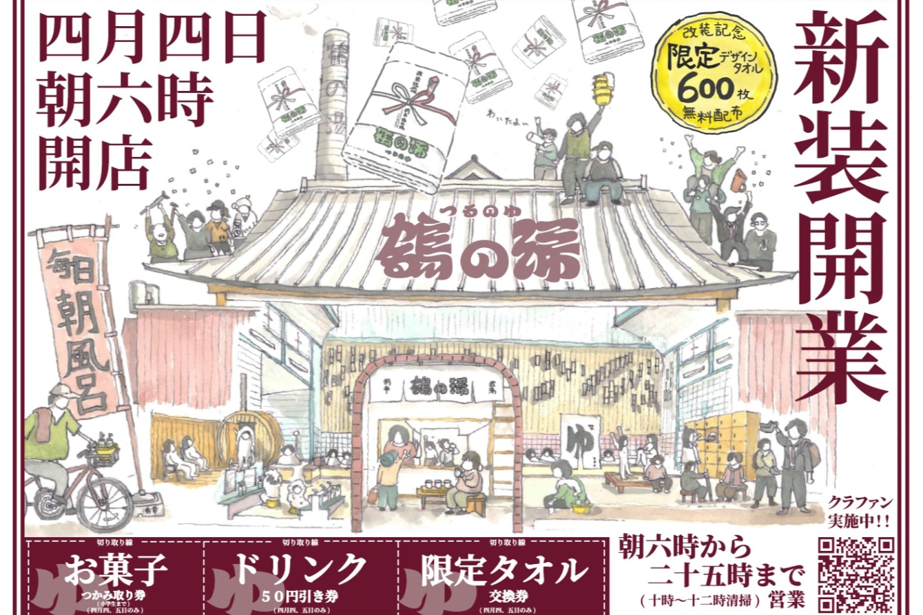 \ついに鶴の湯4月4日OPEN/ みなさんのご支援のおかげで、ついに4月4日(土)朝6時リニューアルオープンできそうです!今回は新装開店を記念し、オリジナル熨斗付きロゴタオルを無料配布します。今回限りの限定緑...