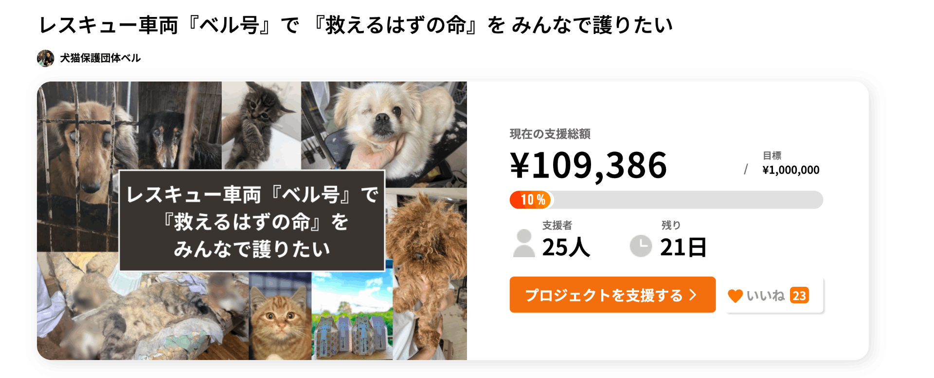 今回の挑戦は、レスキュー専用車両ベル号の導入、そしてこれから増える保護依頼に対応するための医療費確保のための大切な一歩です。