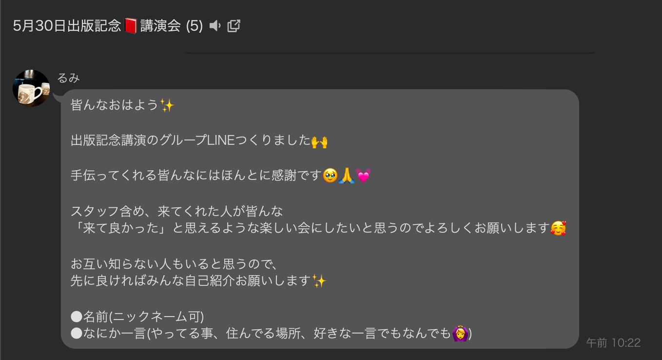 今日の朝、講演会スタッフ権利を購入してくれている方とのグループLINEが始動しました! ここから、5月30日に大阪の心斎橋で開催する講演会、そして懇親会の内容を本格的に企画していきます。