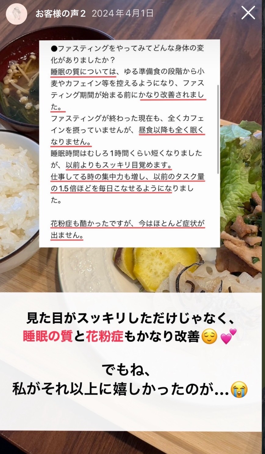 この方は、もともと重度の花粉症に悩まされており、体質改善を目指してファスティングのサポートを依頼してくださいました。