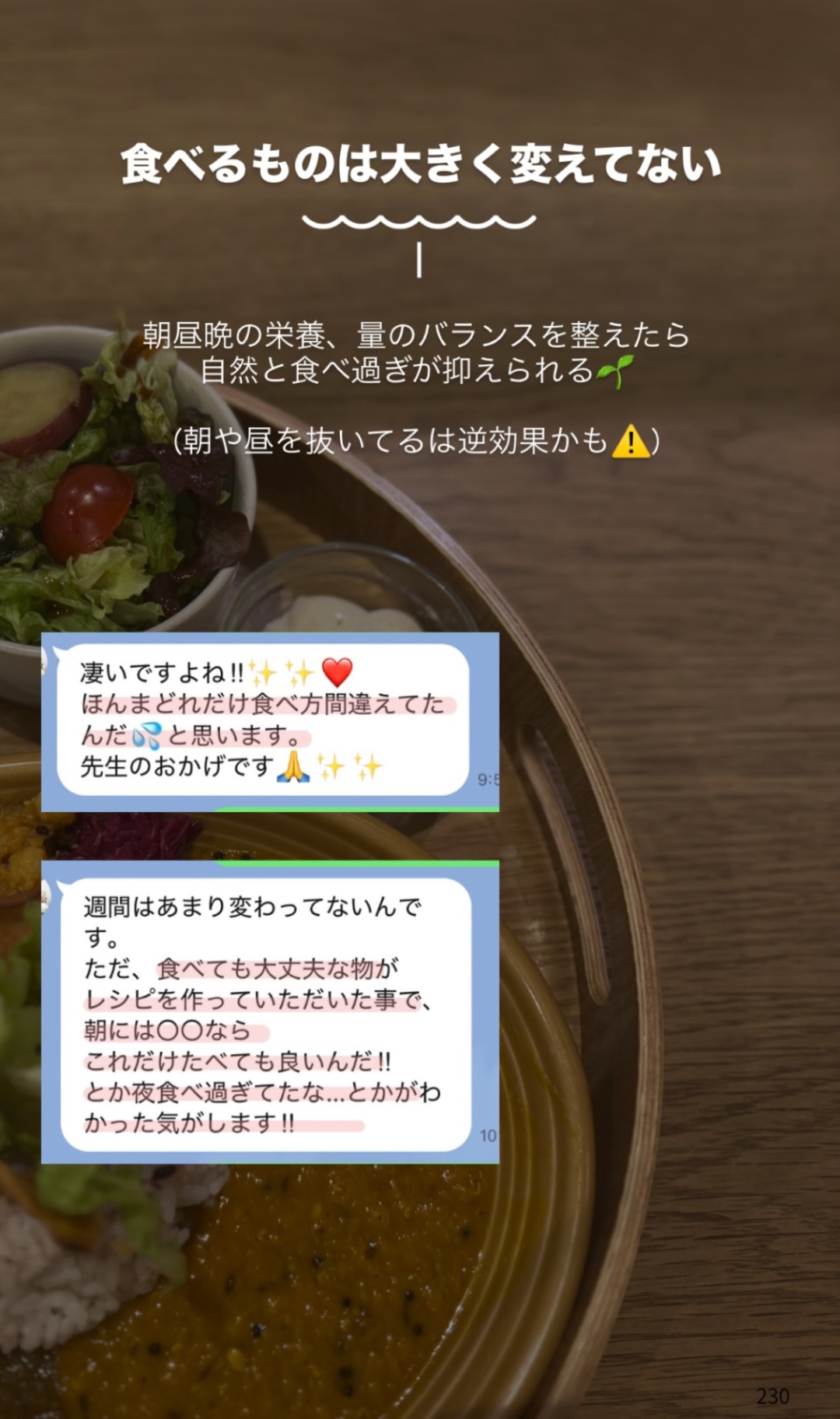 「食べても大丈夫な物のレシピを作っていただいたことで、『これだけ食べても良いんだ!』『夜は食べ過ぎてたな』と気づけました」