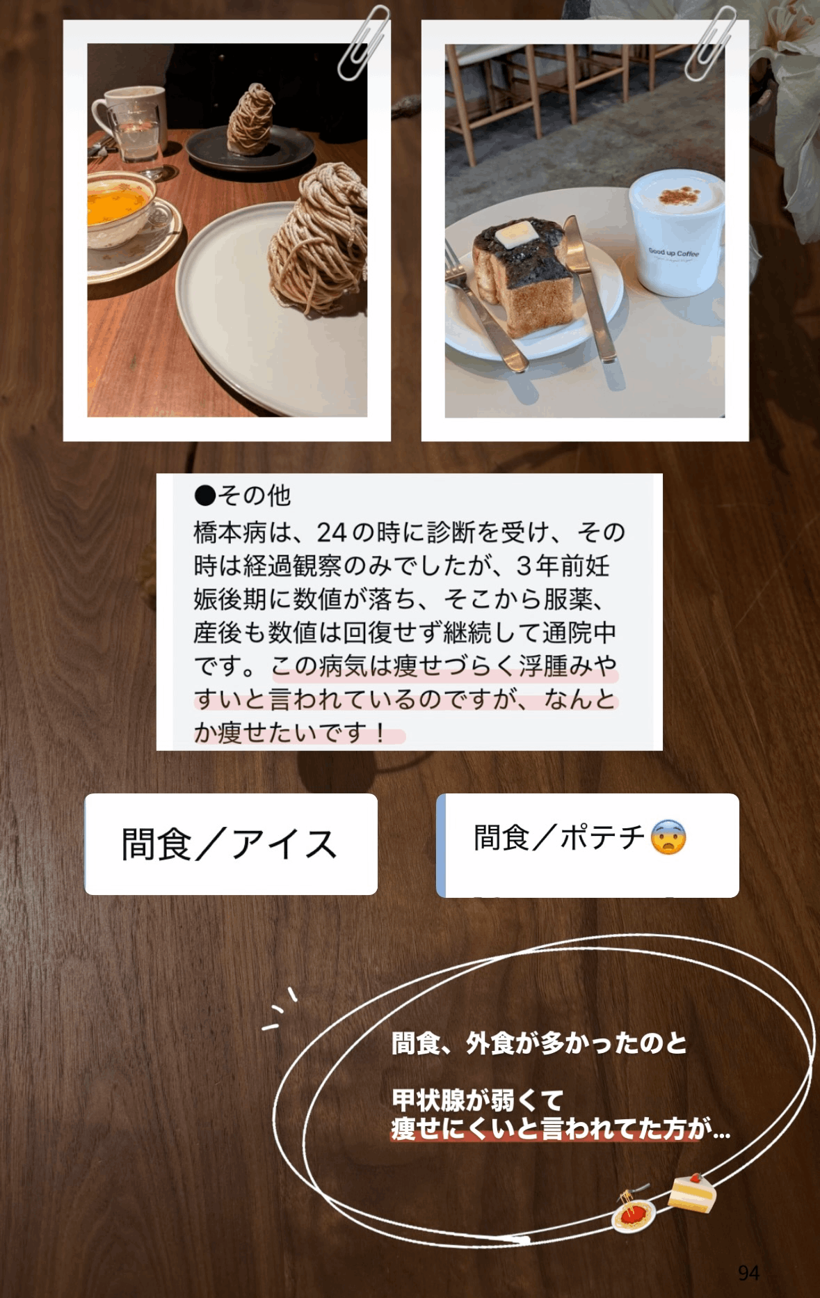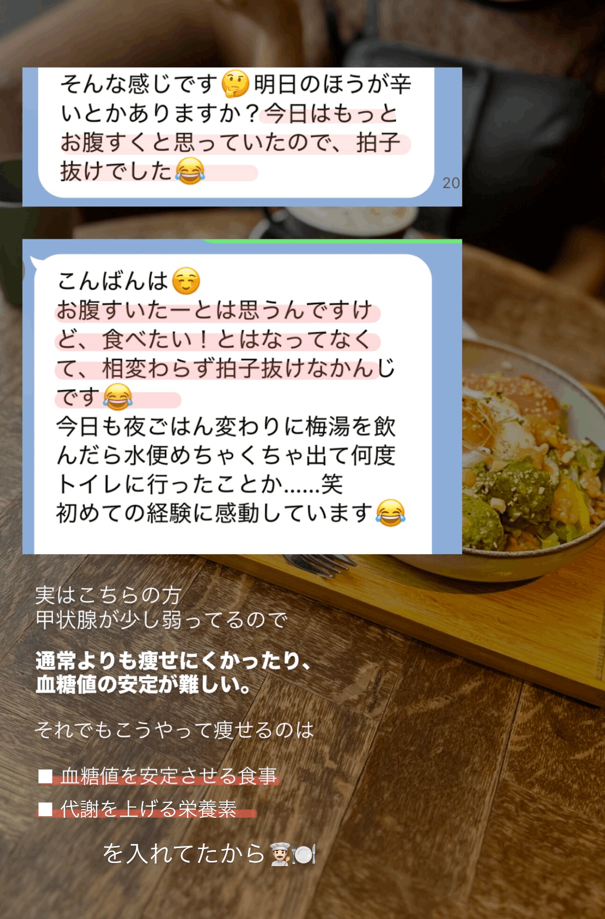 今回ご紹介する方は、甲状腺の機能が少し弱く、「通常よりも痩せにくく、血糖値も安定しにくい」と医師から伝えられていた方です。
