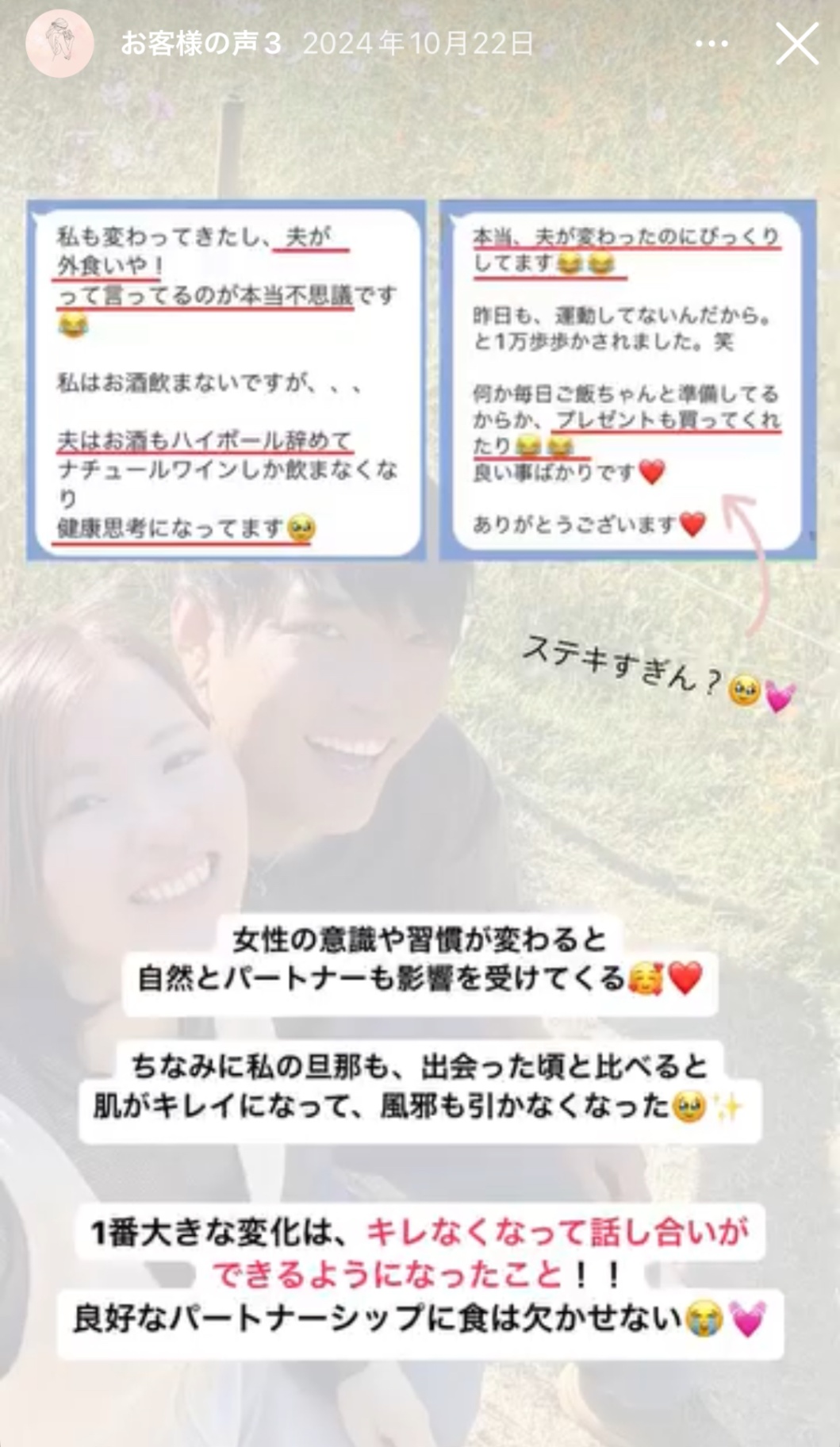 食欲が整う→体が安定する→心に余裕が生まれる→大切な人にやさしくなれる→自信がつく→さらに関係が深まる→人生が豊かになる。