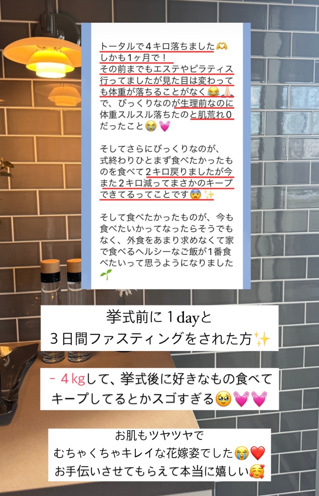 「エステやピラティスに通ってもなかなか体重が落ちなかった」という受講生さま。挙式前に「1day」と「3日間」のファスティングを実践いただきました。