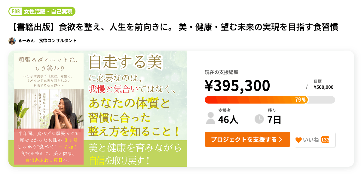 この終盤での押し上げに感動しています!おかげさまで、目標達成率79%!「いいね(お気に入り登録)」での応援も133名に到達しました!