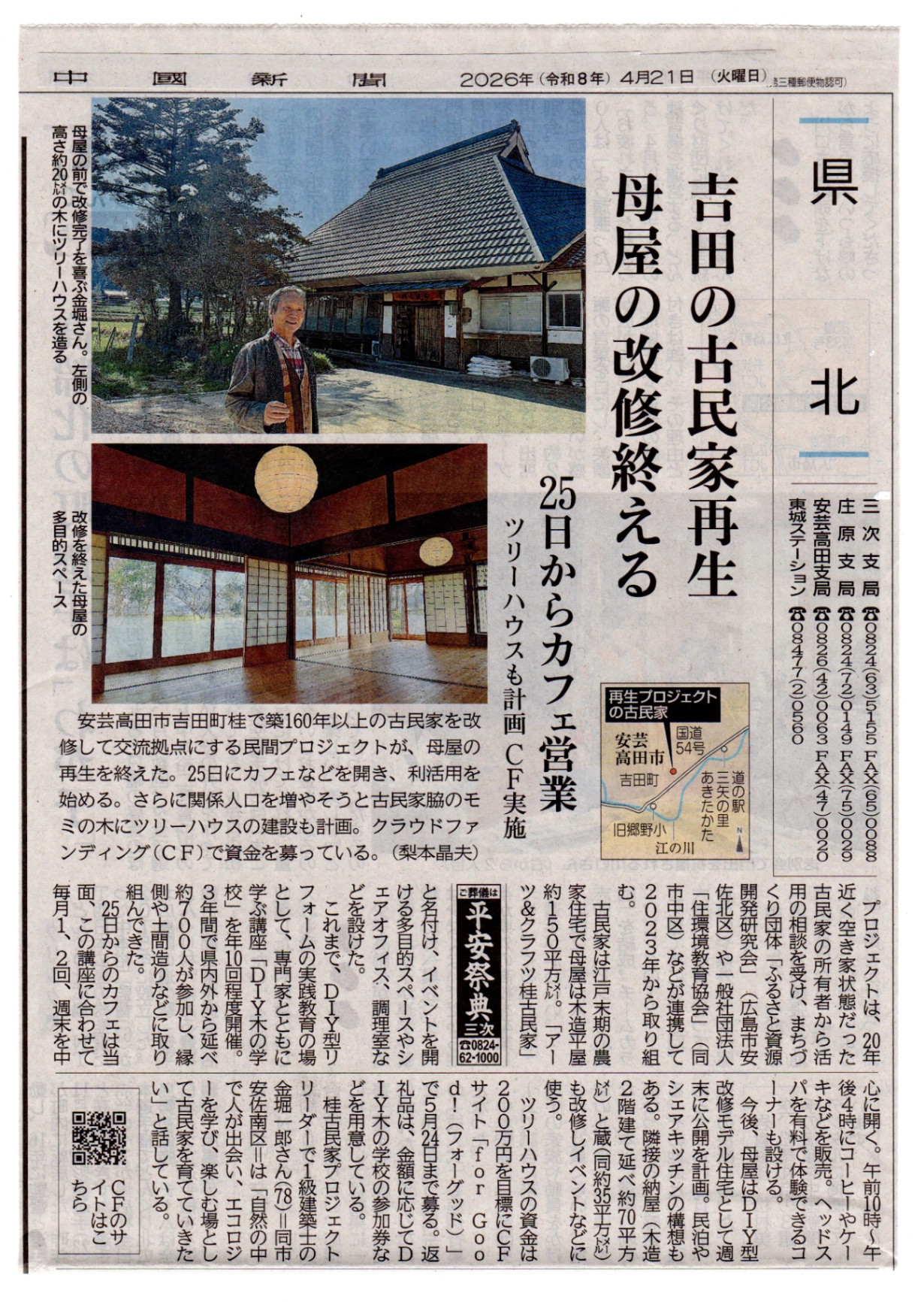 中国新聞に、桂古民家のこと、クラウドファンディングのことを取り上げていただきました。